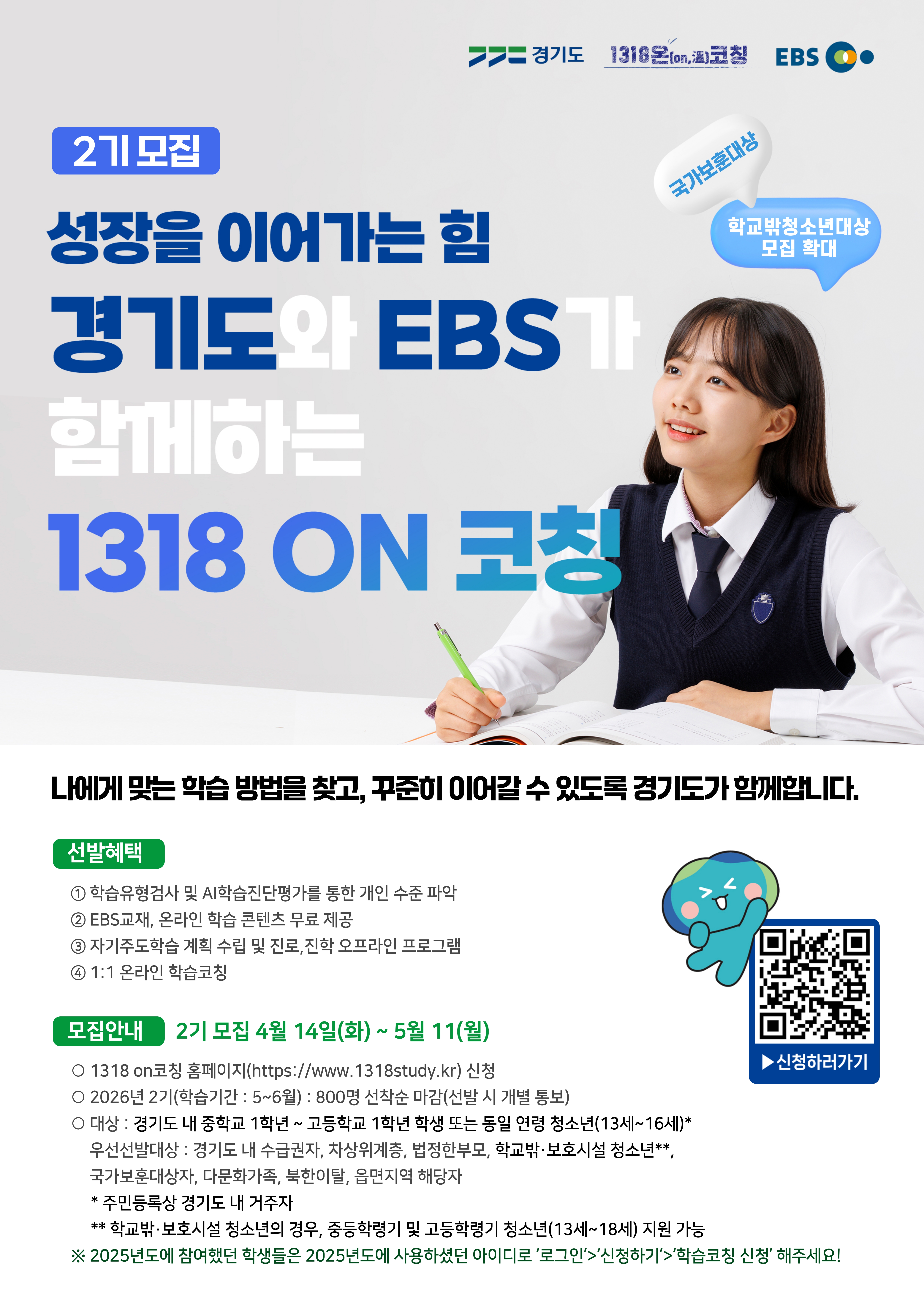 O 모집대상 : 경기도 중학생 또는 동일연령 청소년, 예비 고등학생 또는 동일연령 청소년 ※ 주민등록상 경기도 내 거주자 (2010년 1월 1일 ∼ 2013년 12월 31일 출생자)