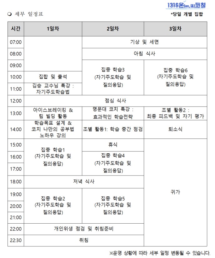 집결 장소 및 일시 등 상세 안내를 위해 안내문과 식단표, 세부 일정표를 배포합니다.